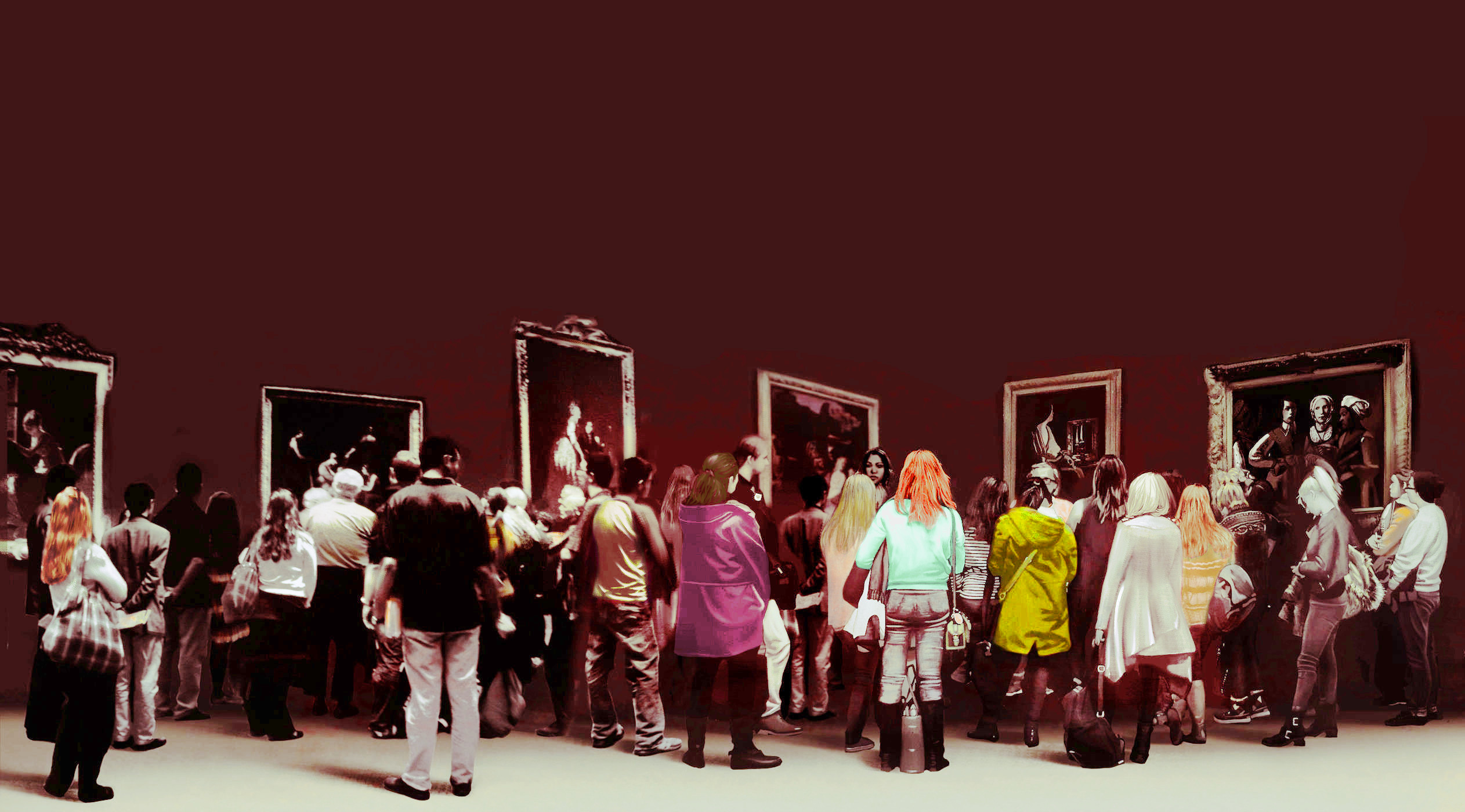 This compositional sketch is the largest version of the Presence cycle paintings. To produce it, the artist combined two previous canvases into a single image. This painting beautifully merges art and life, as the figurative scenes of old masters on the walls are mirrored in the glorious costumes and poses of the crowd, the museum's audience. The colors used here are burnt umber for the backgrounds and multicolored accents on the crowd's clothing.